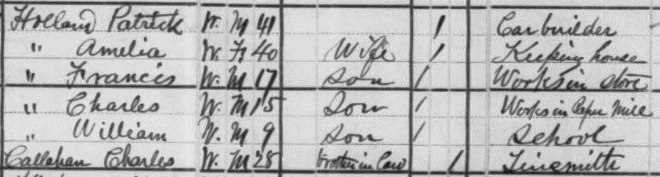 Patrick and Amelia Holland listed as Husband and wife. Patrick listed as a 41 year old Carbuilder born Delaware, and his parents born Ireland. Amelia born Pennsylvania. Her father born Ireland, and her mother born France.