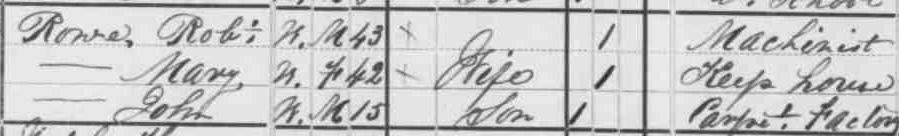 Robert Roe, 43, born England, works as Machinist. Mary, 42 born Ireland, Neither Can Read or Write. Robert and Mary's parents all born in Ireland. Others in household, all born MA: Roe, John, 15, at home