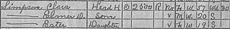Widow Clara Simpson is listed as owner of her home, worth $2,500. She is listed as 57 years old, and 30 at the time of her first marriage. Her father is listed as born in PA, and her mother in Maryland.