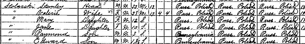 Stanley and Valerie are listed as husband and wife, having been married 13 years. Stanley at 33 years old and wife at 35. Stanley is listed as a laborer in a Steel Mill. They were both born in Russian Poland. Stanley's immigration lsited as 1900, Valerie, Mary and Jane's in 1904.
