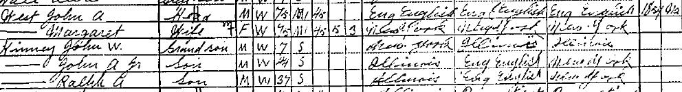 John A and Margaret West listed as Husband and wife, married 45 years. John born in England, and 75y.o. John is listed as Deputy County Clerk, immigrated in 1854, but now Natularized, and Margaret is also listed as 75 years old, born in New York. Margaret is listed as having borne 5 children, but only 3 living at this time.