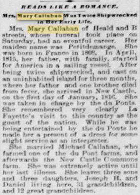 -Mary Callahan immigrated at seven years old on the ship "April", one of the most notorious ship voyages ever made across the Atlantic. After leaving their home in France, and taking the 450 mile